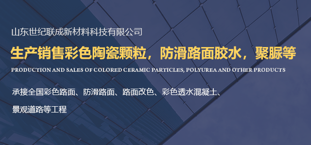 山東世紀聯成新材料科技有限公司,我公司生產銷售彩色陶瓷顆粒、彩色防滑膠水、聚脲等。我公司有經驗豐富的施工團隊,承接全國彩色路面、防滑路面、路面改色、彩色透水混凝土、景觀道路、等工程。